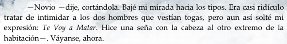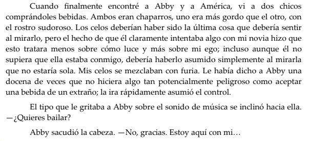 Estoy tratando de buscar la página en la que pasa esto, pero no la encuentro. Resulta que para una pelea, Abby se viste de cierta forma y Travis hace que se cambie de ropa porque «no se concentraría en la pelea sino en que estén mirando a su chica». He freaking did that. Eso es retorcido. Nadie debería obligarte a cambiarte de ropa porque no aceptan el hecho de que otros tipos solo te miren. Y si, digo ‘obligarte’ porque estoy segura de que si Abby se hubiera negado, el tipo le habría hecho el escandalo del siglo. ¿Qué sigue? ¿Revisar los celulares?